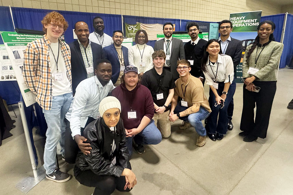 UND had a strong presence at the 2025 North Dakota Transportation Conference in Bismarck, with 18 attendees from the Colleges of Engineering & Mines and Arts & Sciences. The conference was attended by 980 people from government, consulting firms, contractors, material suppliers, academia, etc. Governor Armstrong, Director Ron Henke, and Deputy Director for Engineering Matt Linneman presented their vision for our state’s transportation industry. Eight people presenting posters and display materials represented the Transportation Technology Research Institute (TTRI) and the Student Design Center, highlighting UND’s contributions to transportation and infrastructure research.