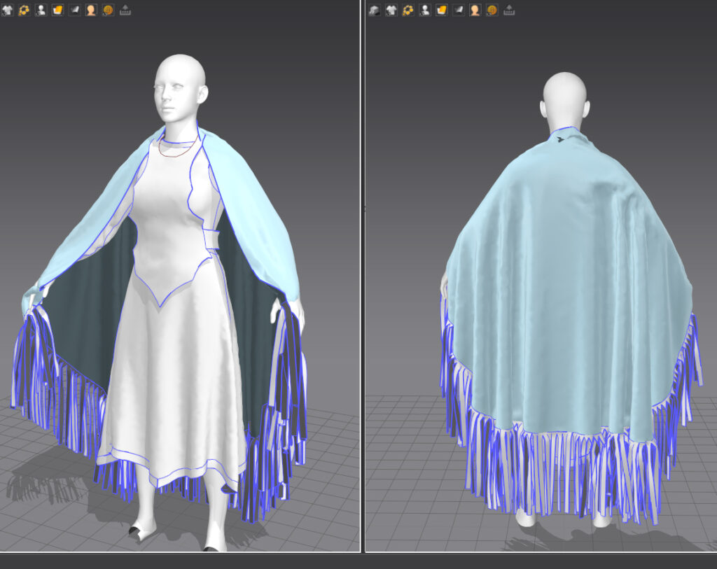 Currently, the fancy shawl design is lacking color and accessories. I will be creating the colored patterns in a 2D format before adding them to the design Below. In the past when patterns were applied to the regalia before all changes were made in Marvelous Designer, the 2D patterns wouldn’t fit correctly. Adding the 2D patterns last will make for a cleaner design.