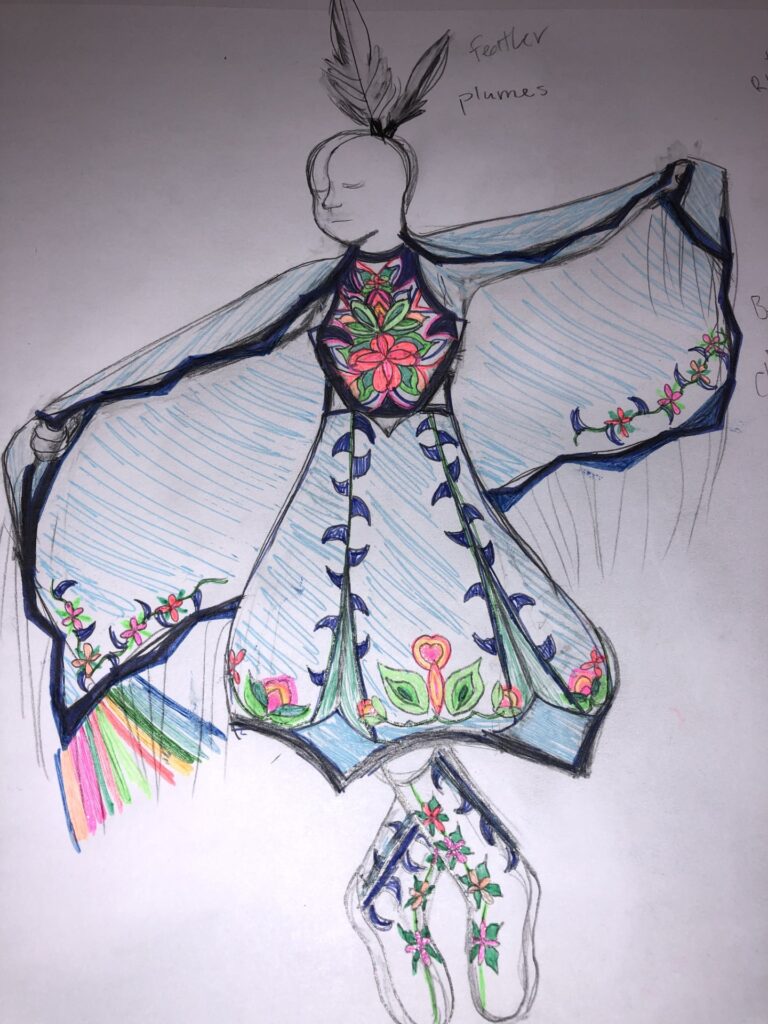 First, I started out making the fancy shawl regalia design by hand sketching (the same I did the past designs). Then only sharing one sketch with the ND Advisory committee and my intention of using neon colors, everyone was pleased. I am now making the patterns to apply to the fabrics. The reason for including neon colors is it would be a good contrast to the other designs. Below you can see the inspiration sketch of the design.