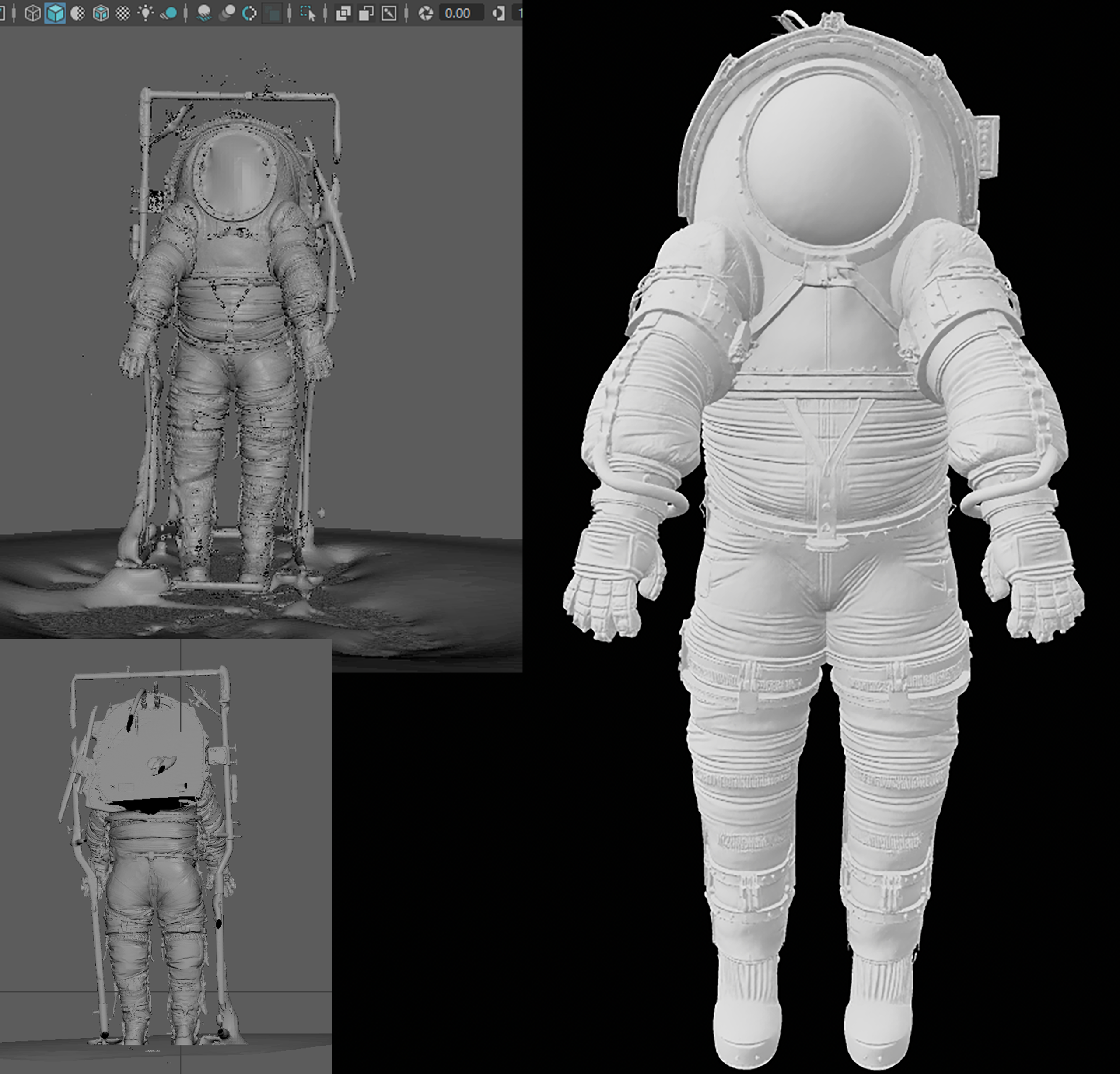 Another exciting project has been the 3D modeling of a spacesuit we scanned on campus a few months ago. I’ve been cleaning up the scan and refining the mesh in Maya and ZBrush. The models that are produced from the Artec 3D scanners in the DREAM Lab can have many uses. At the current stage, it could be prepared to be printed on a 3D printer. We have plans to texture and further enhance this model to be more accurate to the real-life version of this spacesuit and have various uses. So far, the scan has served as a guide to create a more quality model.
