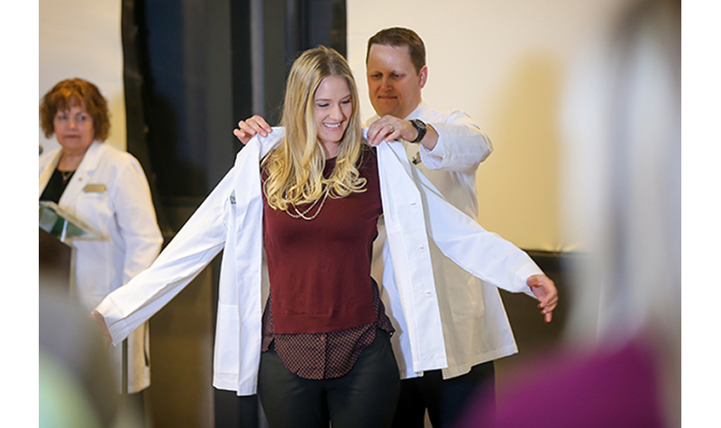 “The presentation of the white coat is symbolic of the new profession the students are entering,” said Department of Physician Assistant Studies Chair Jeanie McHugo, Ph.D., PA-C. “The coats will be worn by students through the clinical phase of their training and denote their involvement with the PA program at UND.”