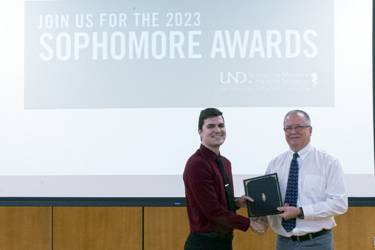 Several second-year medical students at UND’s School of Medicine & Health Sciences received awards on Tuesday, Jan. 13, at the School’s 2026 Sophomore Awards Ceremony. Academic, teaching, and service awards were awarded on behalf of the School and the North Dakota Medical Association, including: North Dakota Medical Association Awards Awarded to second-year students who were […]