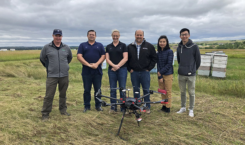 UAS operations conducted by UND and Bee Innovative began last week over two sunflower fields near Bismarck, N.D. Shown from the left are UND UAS pilot James Moe, David Lyall, Kate Lyall, Paul Snyder, Haochi Zheng and student Jiyang Zhany. Photo courtesy of UND Aerospace.