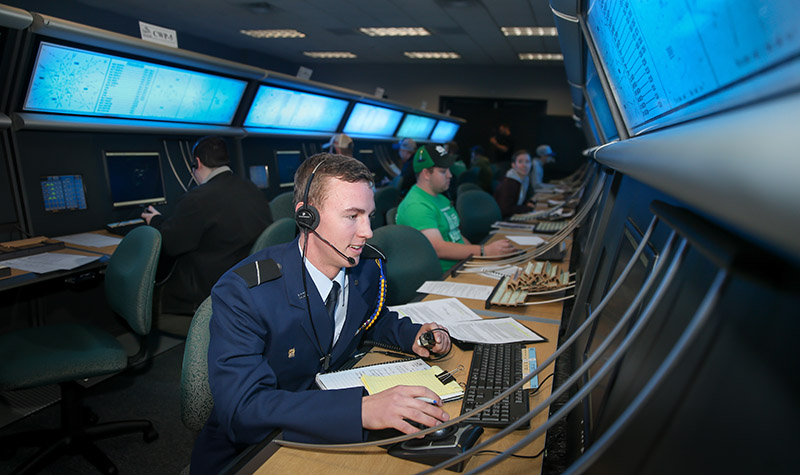 Students’ first stop is typically the program’s 32-position radar lab in Ryan Hall. In the same building is a 225-degree control tower simulator.