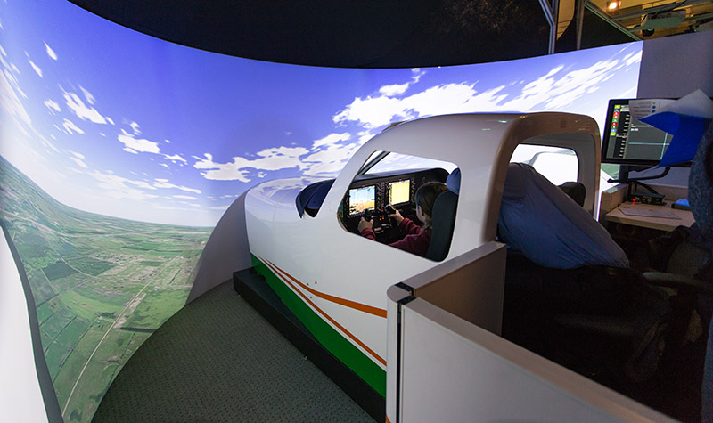 Meanwhile, Clifford Hall houses the 360-degree tower simulator, where students track, spot, talk with and control virtual aircraft as the planes approach, land, taxi and take off in real time.