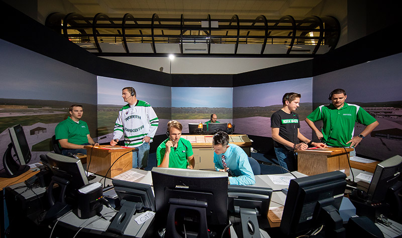 But Clifford Hall’s 360-degree tower represents the ultimate experience for a controller-in-training — a place where the pen and paper know-how meets experiential coursework. It’s a hub of activity during an upper-level class session, in this case led by Paul Drechsel, associate professor and director of UND’s program.