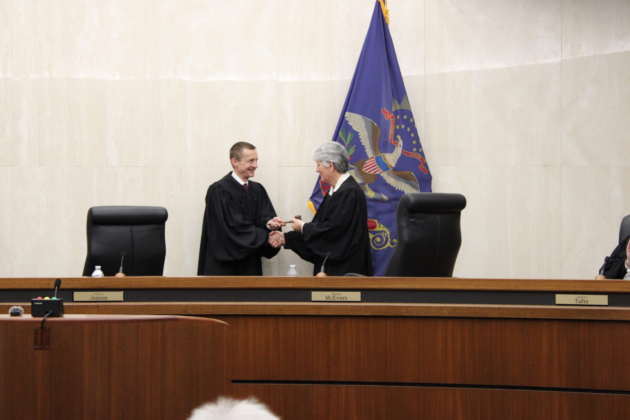 Chief Justice Jon J. Jensen formally transfers the gavel to Chief Justice-elect Lisa K. Fair McEvers