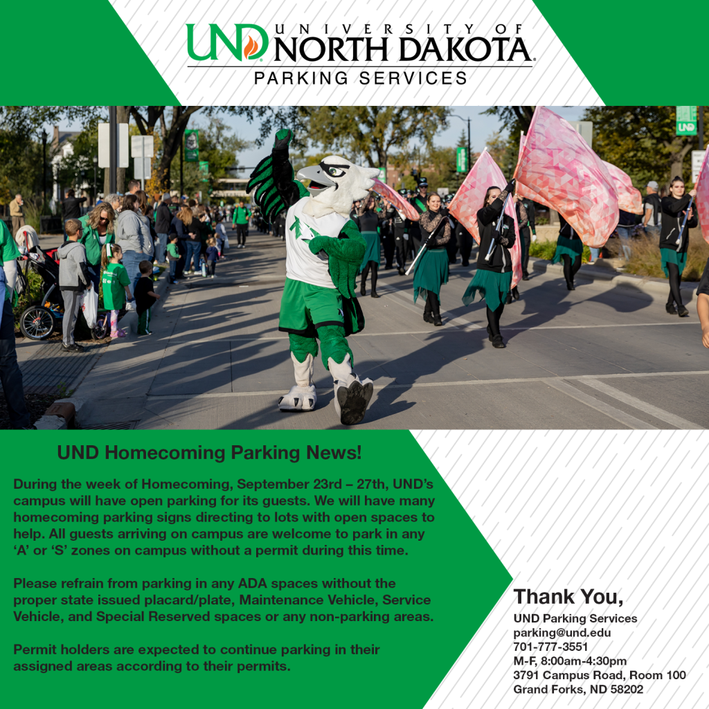 During the week of Homecoming, September 23rd – 27th, UND’s campus will have open parking for its guests. We will have many homecoming parking signs directing to lots with open spaces to help. All guests arriving on campus are welcome to park in any ‘A’ or ‘S’ zones on campus without a permit during this time.