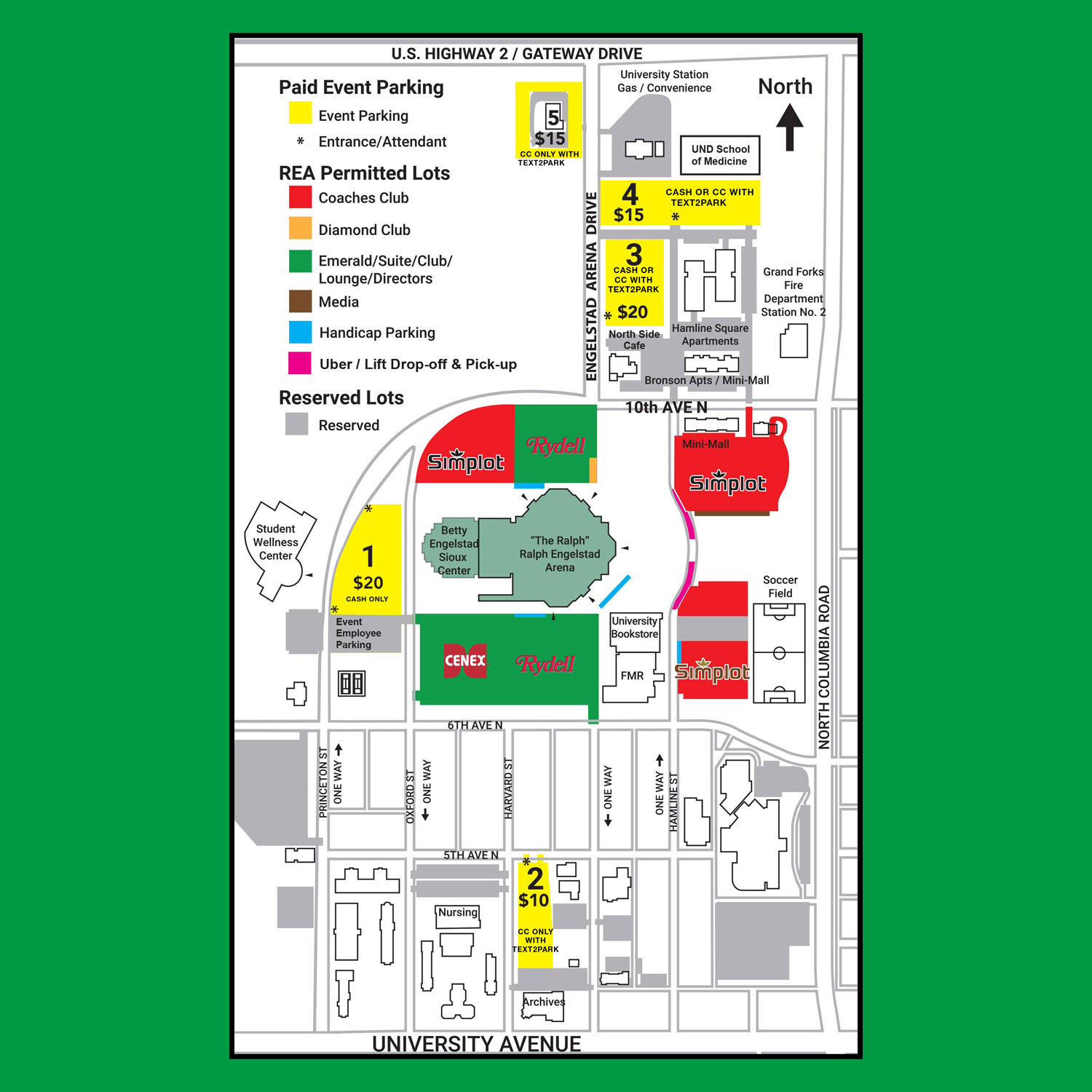 - Lot 4 Wellness Center – Cash ONLY – $20/vehicle at the UND parking lot directly east of the UND Wellness Center.