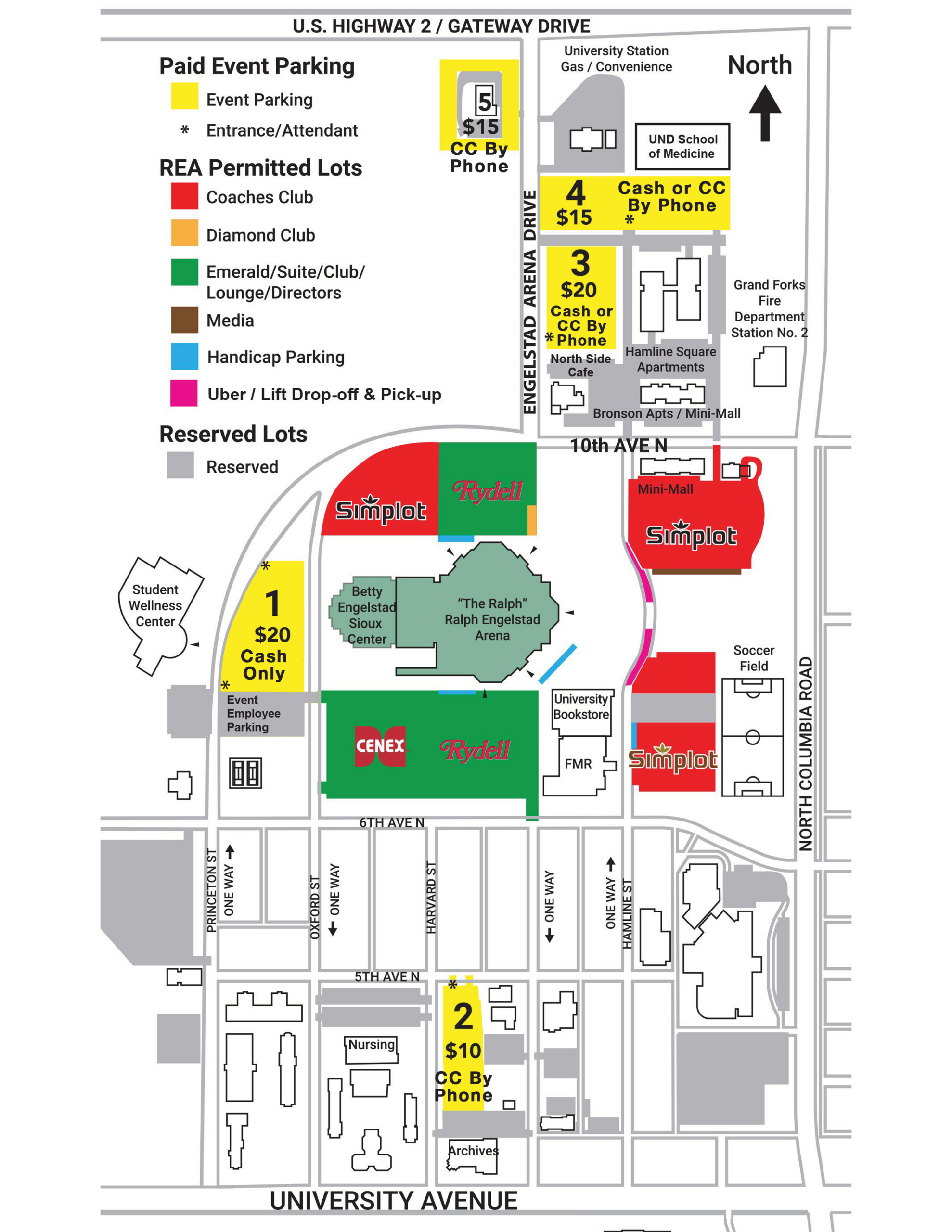 - SMHS SW Lot (off Ralph Engelstad Arena Drive) – Cash or Credit Card – $20/vehicle at the lot located behind Northside Cafe on Ralph Engelstad Arena Drive