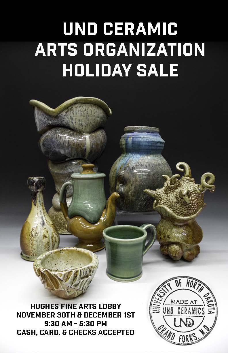 The UND Ceramic Arts Organization is hosting its Holiday Sale in the lobby of the Hughes Fine Arts Center on Wednesday and Thursday, Nov. 30 and Dec. 1, from 9:30 a.m. to 5:30 p.m.