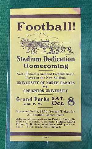 The contents of the capsule were revealed toward the end of the ceremony. They included vintage copies of The Dakota Student, The Grand Forks Herald and Alumni Review, various stadium fund-raising promotions and an actual ticket to the dedication and first game played at Memorial Stadium, on Homecoming Saturday, Oct. 8, 1927 — against Creighton University.
