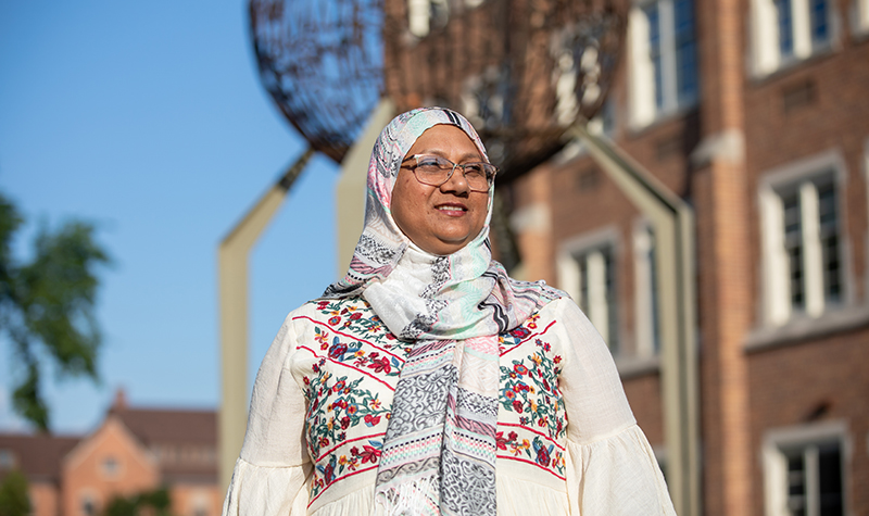 Khan’s journey at UND began shortly after she and her family moved to Grand Forks from California. Khan and her husband, Shafiqul, had operated a business for some time after emigrating from Bangladesh 25 years ago, but thought North Dakota would be a better place to raise their son, Ahad, and daughter, Newzaira, as well as advance themselves.