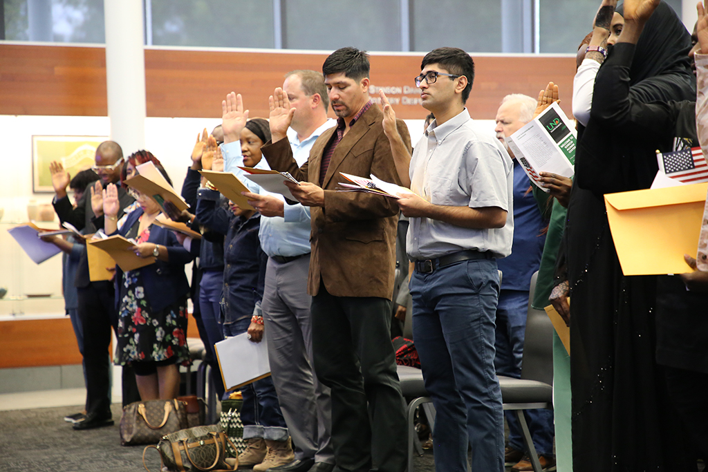 People set to become new American citizens take the Oath of Citizenship at the Gorecki Alumni Center on Friday, Sept. 16. Photo by Adam Kurtz/UND Today