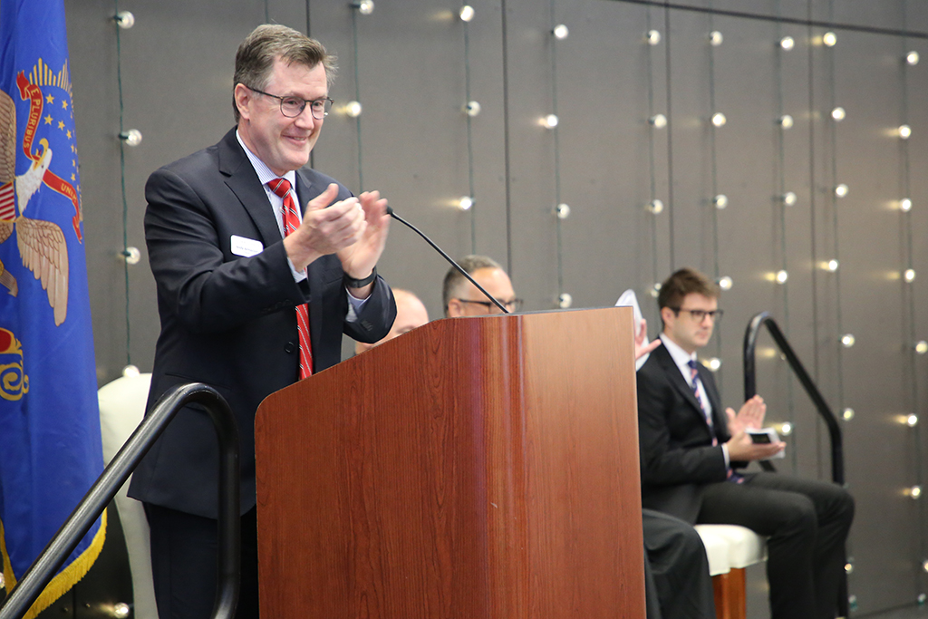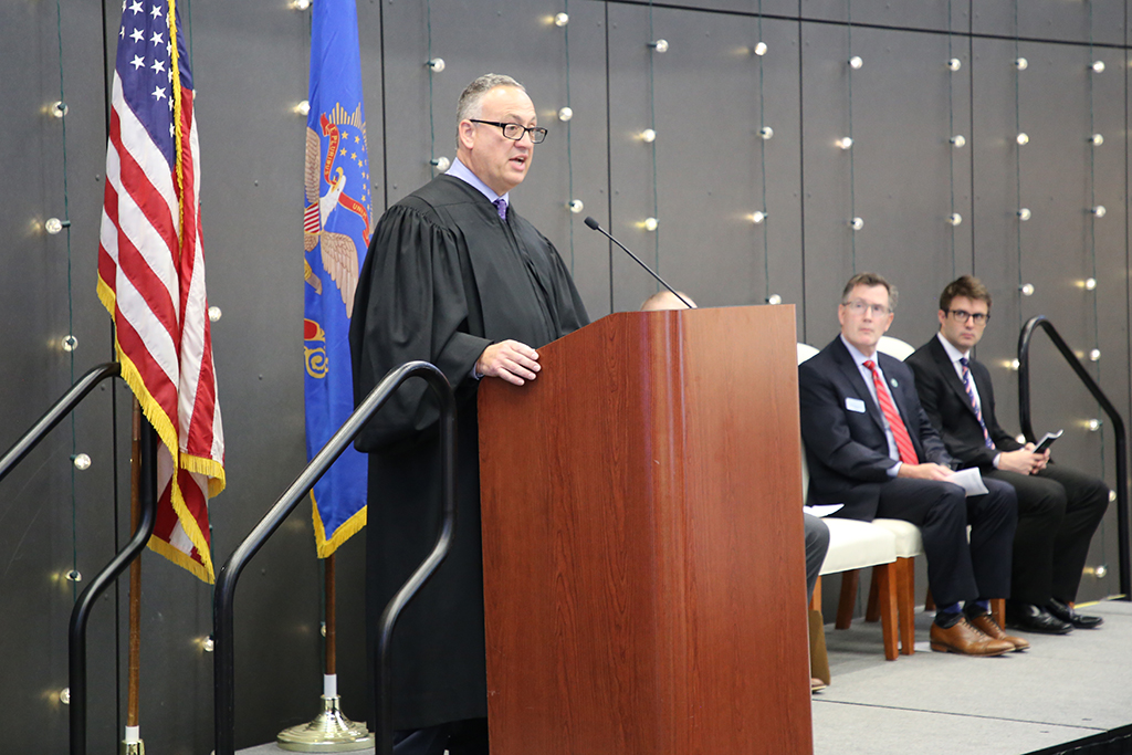 Peter Welte, chief judge of the District Court of North Dakota, addresses attendees of the Naturalization Ceremony on Friday, Sept. 16, While UND President Andrew Armacost looks on. Welte administered the Oath of Citizenship to 38 new Americans. Photo by Adam Kurtz/UND Today
