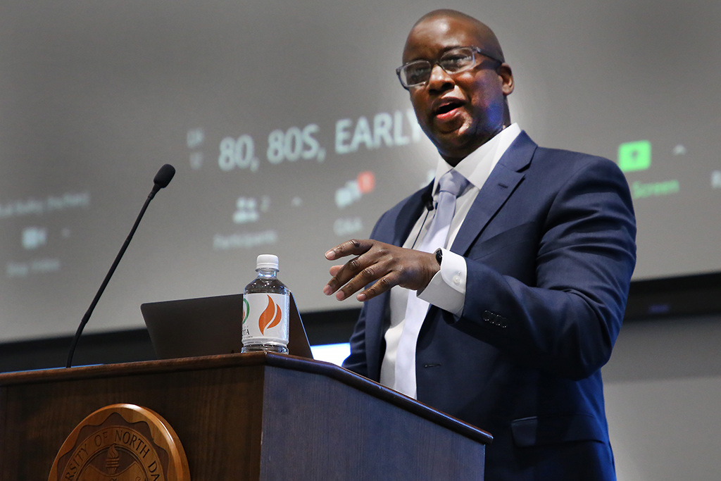 Darrick Smith speaks to a full house at UND’s first-ever Diversity, Equity & Inclusion in Higher Education and Beyond conference on Thursday in the Memorial Union. Adam Kurtz/UND Today.
