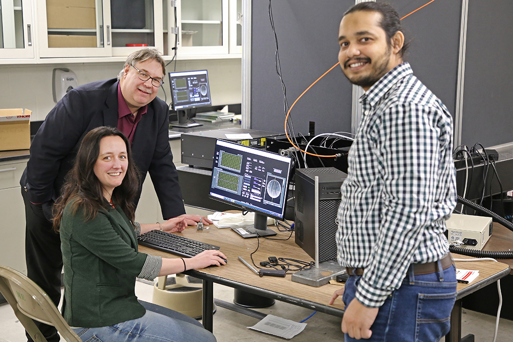 Hallie Chelmo, assistant professor of Mechanical Engineering, seated, and David Delene, research professor of Atmospheric Sciences, left, work in Chelmo’s lab while doctoral student Imteaz Osmani assists. Photo by Adam Kurtz/UND Today.