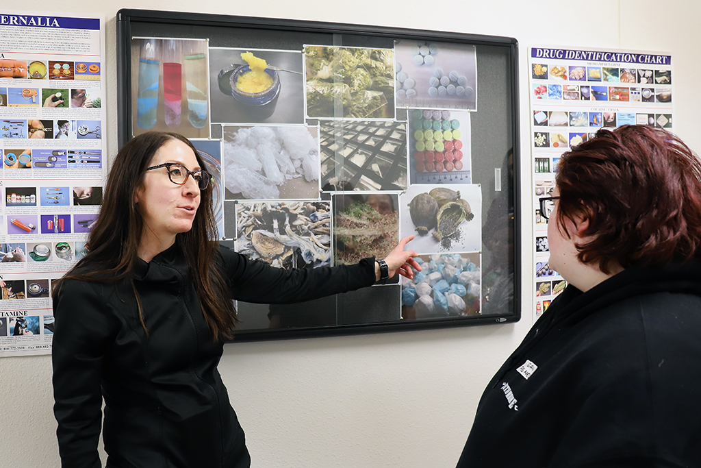 Charlene Rittenbach points out some visual cues often spotted by investigators when trying to first identify suspected illegal drugs. Photo by Janelle Vonasek/UND Today.