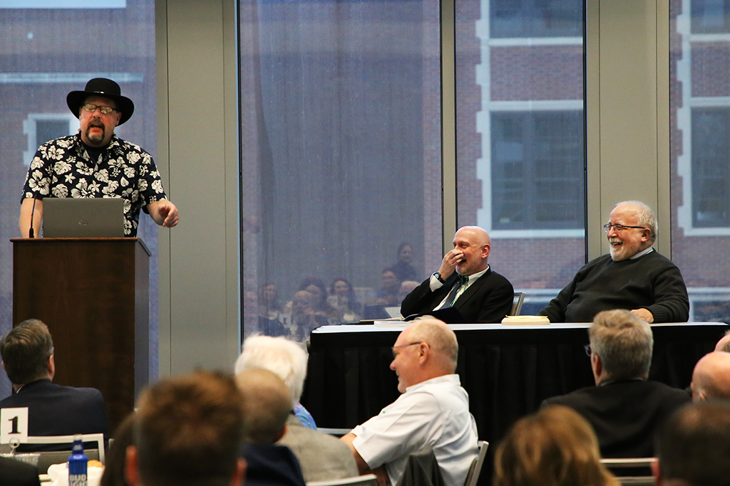After dinner, the roast of Tom Petros took place. Several of Petros’ longtime colleagues took turns telling lighthearted jokes at Petros’ expense and reflected fondly on his long career with the University.