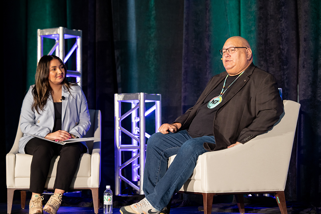 A member of the Sioux and Assiniboine Tribes of the Ft. Peck Indian Reservation in northeast Montana, McCracken appeared onstage opposite Laine Lyons, director of development at the College of Arts & Sciences for the UND Alumni Association & Foundation.