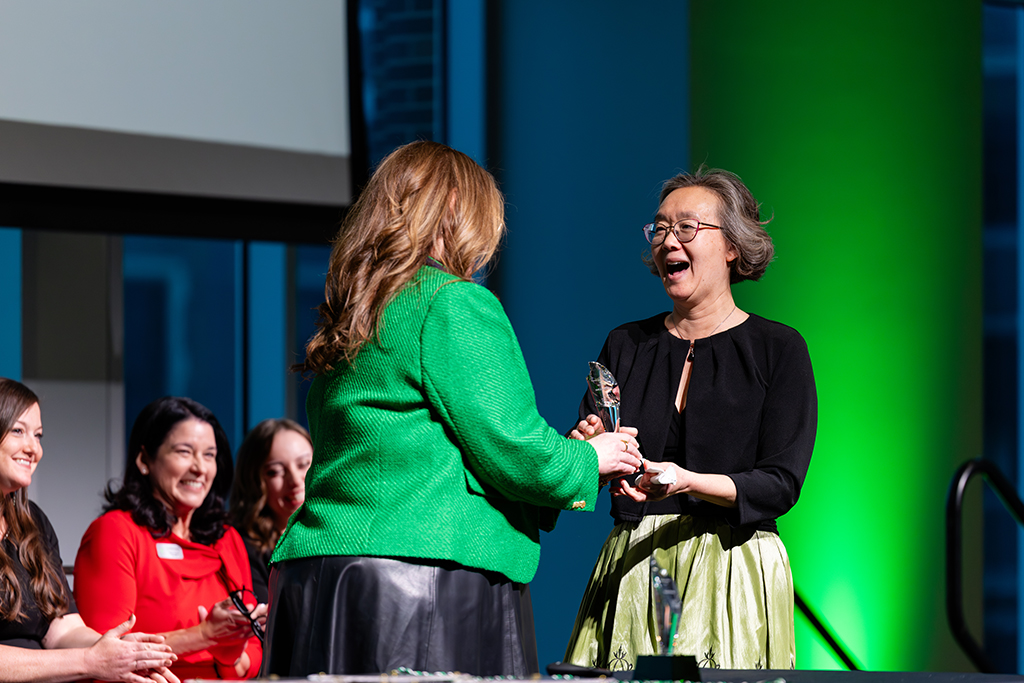In her acceptance speech, Chu – who is also a first-generation college graduate – praised the college for the support she received in pursuing her doctorate in teaching and learning with an emphasis on higher education.